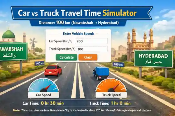 The 100 km journey from Nawabshah to Hyderabad provides a simple and clear example of mathematical application. When the car travels at 200 km per hour, it takes 30 minutes. When the bus travels at 100 km per hour, it takes 1 hour.